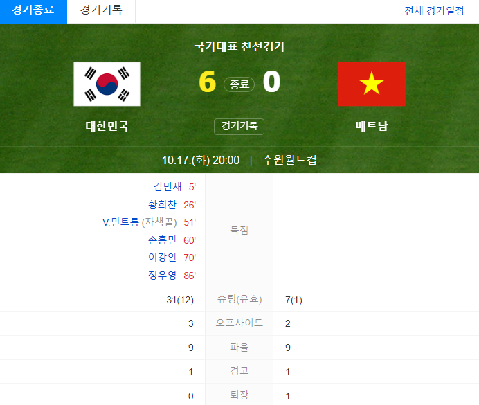 한국 베트남전에서 6:0으로 대파했죠.