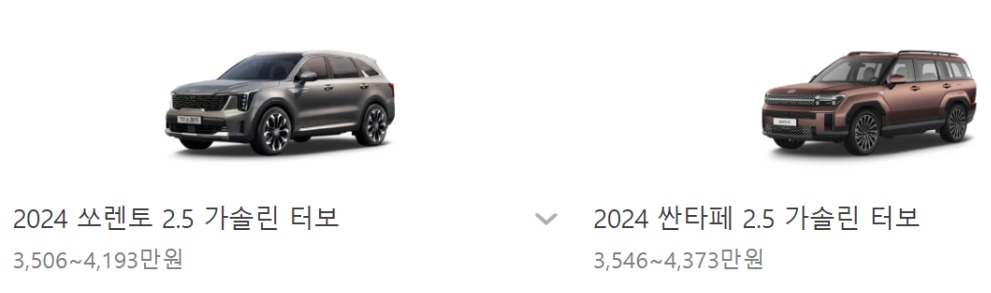 | 싼타페 익스클루시브 (3,546만 원 ) | 쏘렌토 프레스티지 (3,506만 원 ) |