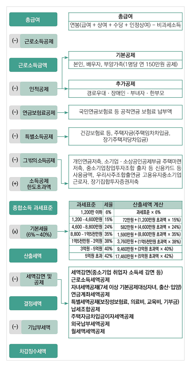 - 근로소득금액 – 인적공제 – 연금보험료 공제 – 특별소득공제 – 기타소득공제 = 종합소득 과세표준