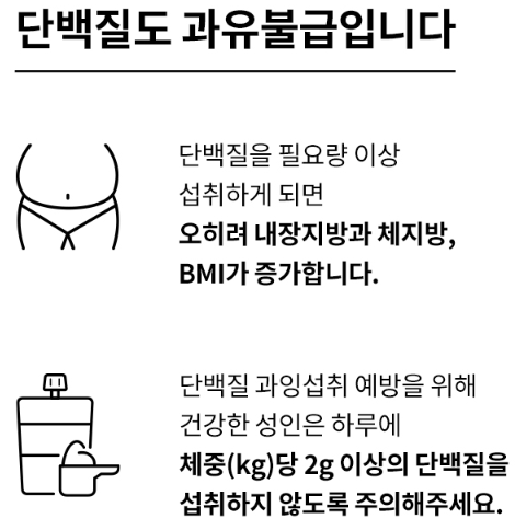 단백질의 경우 체중(kg) 당 2g 이상의 단백질을 섭취하는 것은 불필요합니다. 너무 많이 드시면 오히려 내장지방과 체지방이 증가하여 역효과가 날 수 있기 때문에 권장 섭취량에 맞게 섭취하시기 바랍니다.