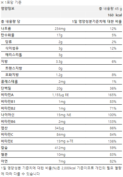 단백질에만 신경 쓴 것이 아닌 균형 잡힌 한 끼를 위해 골고루 섭취할 수 있도록 영양 배합도 고려하여 제작했다고 합니다. 이 외에도 식이섬유를 보충하기 위한 원료와 탄수화물 단백질 지방 대사에 관여하는 비오틴까지 골고루 배합하여 완성 했습니다.