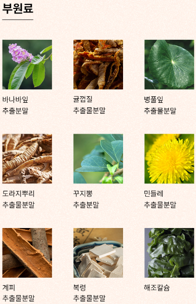 | 철 | 아연 | 치커리뿌리추출물 | 난소화성말토덱스트린 | 비오틴 |