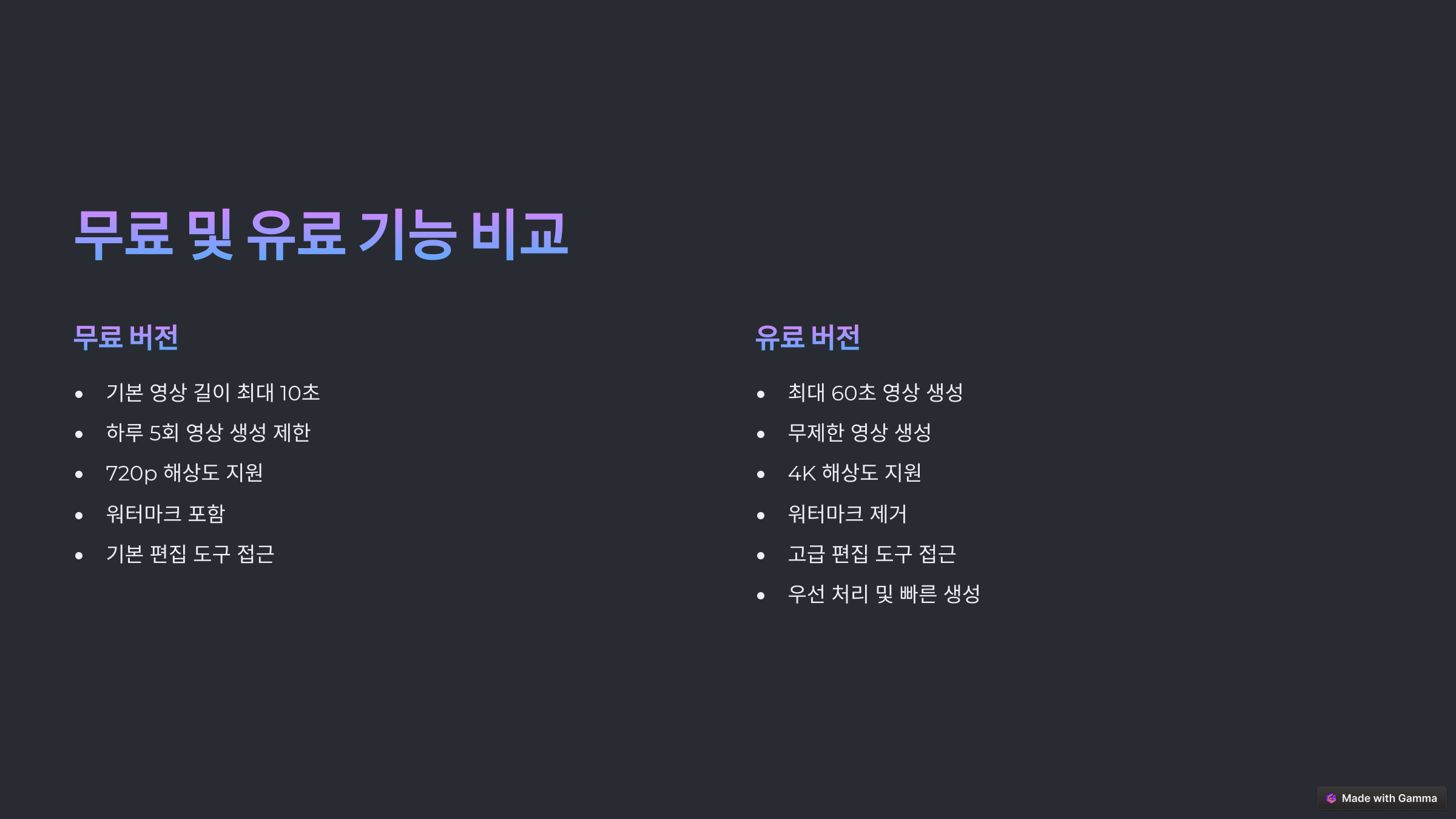 | AI 영상 생성 길이 | 30초 | 10분 이상 가능 |