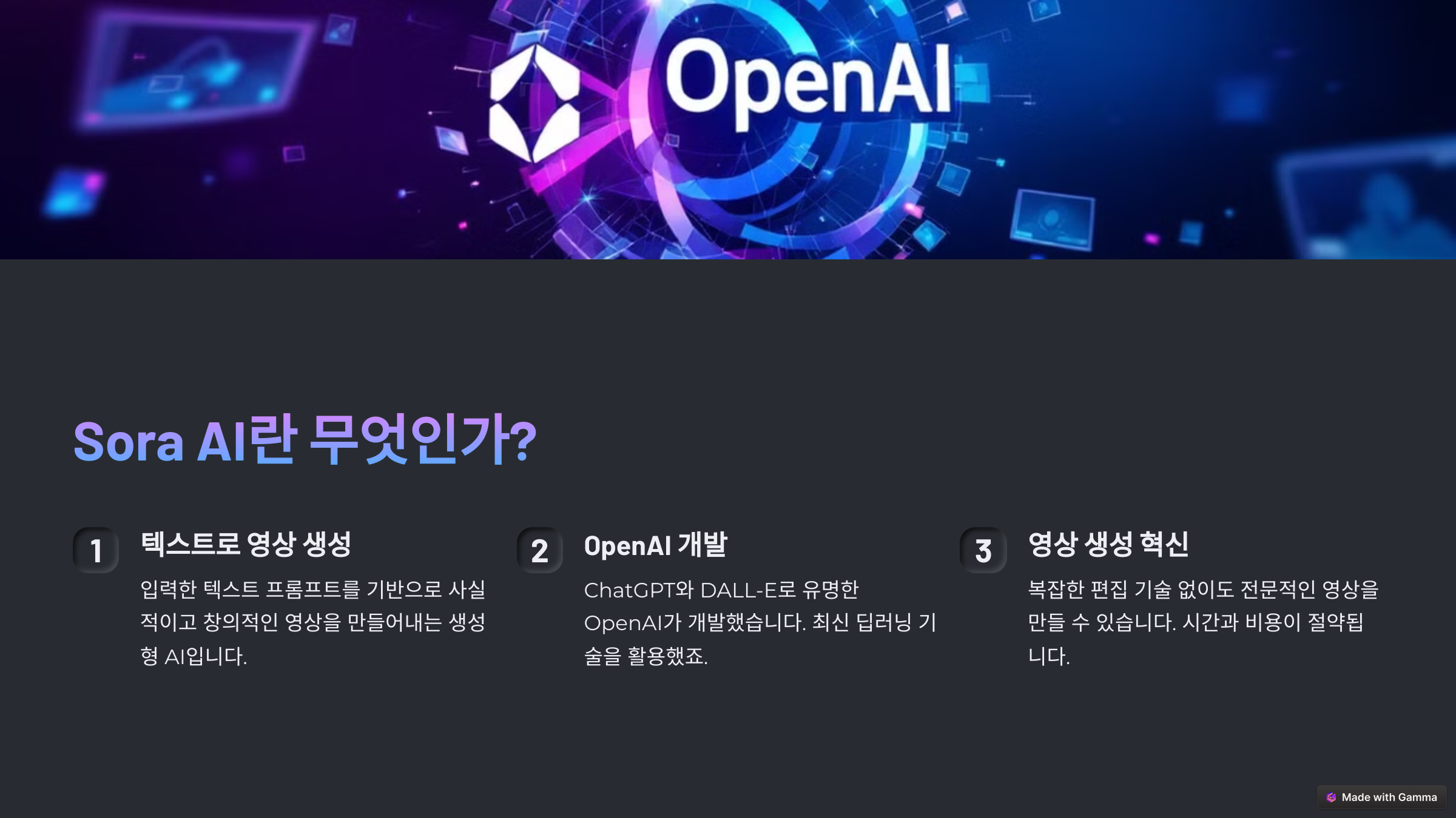 영상 콘텐츠의 중요성이 날로 커지는 시대에 AI 기술을 활용한 자동 영상 제작이 큰 주목을 받고 있습니다. 특히 OpenAI에서 개발한 Sora AI는 텍스트 입력만으로도 고품질 영상을 생성하는 혁신적인 AI 모델로, 영상 제작의 패러다임을 완전히 바꿀 가능성이 큽니다. 기존의 영상 편집 기술이 없어도 몇 번의 클릭만으로 고퀄리티 영상을 제작할 수 있어, 유튜브 크리에이터, 마케팅 전문가, 블로거, 교육자 등에게 매우 유용한 도구입니다.